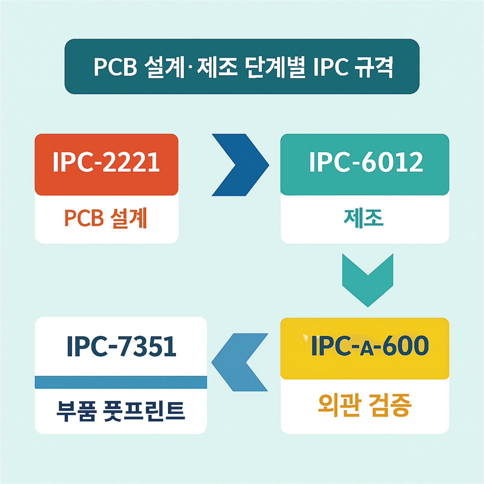 부품 풋프린트(IPC-7351), 외관 기준(IPC-A-600) 병행 활용.
