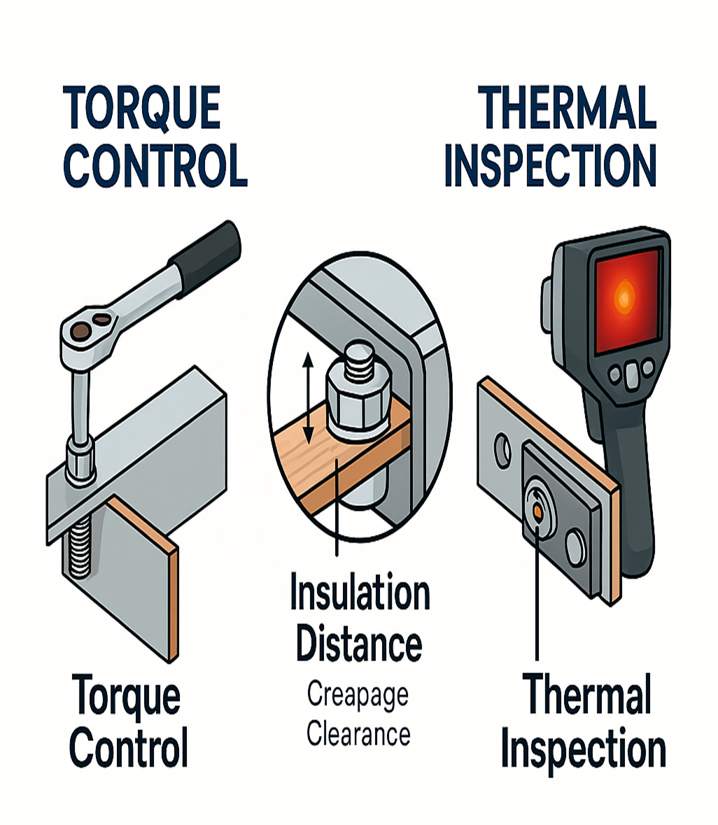 접촉저항, 체결 토크, 표면 산화막 등이 발열 원인입니다. 주기적인 체결 토크 점검이 필수입니다.